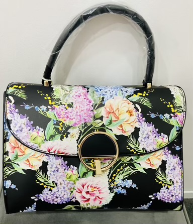 Black Or White Floral Handbag With Shoulder Strap And Gold Ring Detail