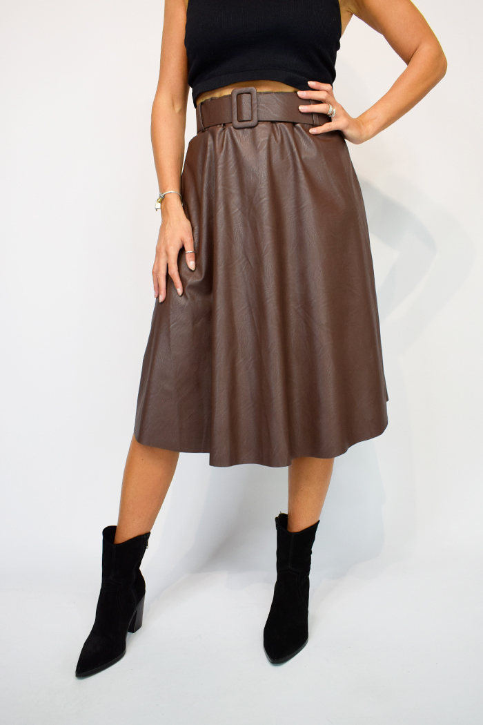 Chocolate Brown, Black, Or Tan PU Belted Midi Skirt