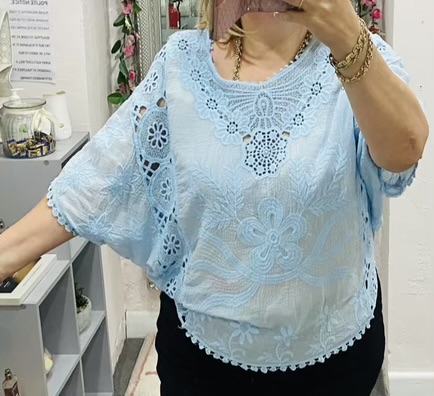 Floral Lace And Crochet Cotton Mix Batwing Top In Mint, Blue, White, And Light Beige