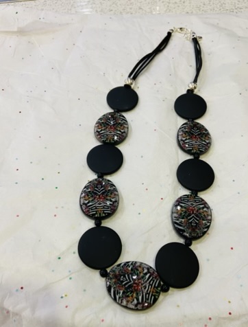 Floral Print With Black And White Ripple Effect Disc Detail Long Necklace