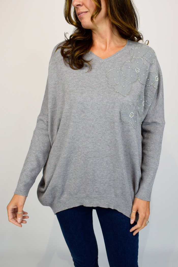 Grey Or Camel Lace Floral Embellished Long Line Oversized Jumper