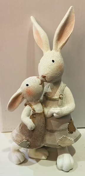These delightful bunnies feature a natural tone finish, showcasing a mother rabbit and her daughter, both dressed in intricate outfits.
