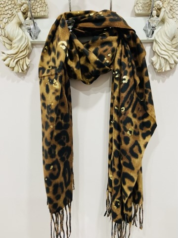Mustard/Black Animal Print Scarf With Gold Foil Detail Wool Mix Scarf