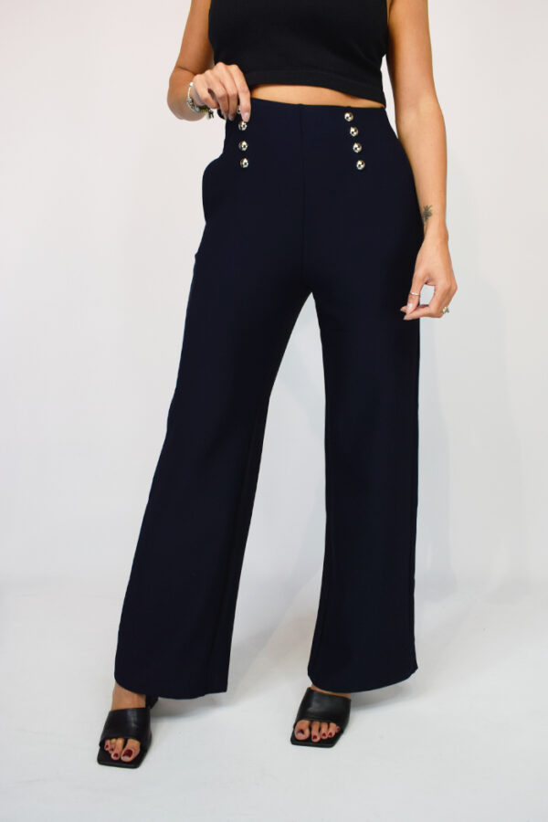 Navy High Waisted Button Front Stretch Cotton Mix Trousers In Various Sizes