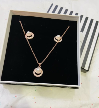 Rose Gold Double Halo With Faux Pearl Centre Piece Pendant Necklace And Earring Set