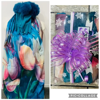 Teal Tulip Print Scarf With Faux Fur Trim Gloves Gift Set