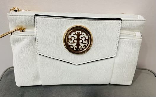 White, Light Beige, Or Gold Cross Body Bag With Large Gold Disc Embellishment